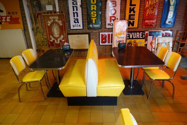 dubbelzijdige zitbank (1200x1000), 2x tafel (1200x750x770), 4x stoel, made in USA