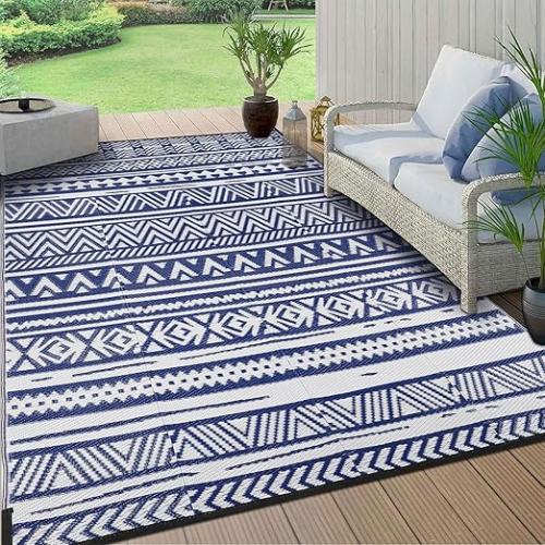 Ongebruikt, ok. SHACOS Buitentapijt, 180 x 270 cm waterdichte picknickdeken omkeerbare vloermat draagbaar plastic strotapijt lichtgewicht RV campingmat geweven geometrisch tapijt voor terrasdek picknick strand, blauw, B09YTTX5PZ