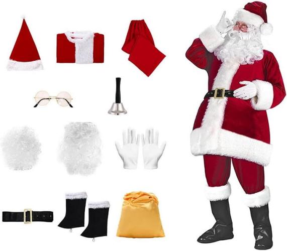 Ongebruikt, ok, Licus Kerstmankostuum Deluxe 2XL , 11-delig Santa-Clauskostuum Kerstman, B0BF5CZKQ6 , bevat: rode pluche kerstjas met ritssluiting, broek, kerstmuts, riem met gesp, laarsmanchetten met bijpassende witte pluche manchetten, handschoenen, bril, pruik, baard en gouden cadeauzakje, kleine bel ,