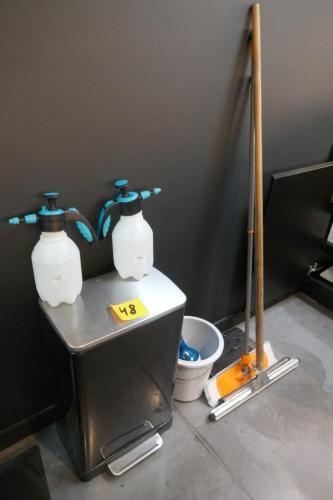 Huisraad : Trekker en swifter - metalen vuilbak -emmer - spuitflessen - diverse glazen en koffiekopjes - keukenmateriaal