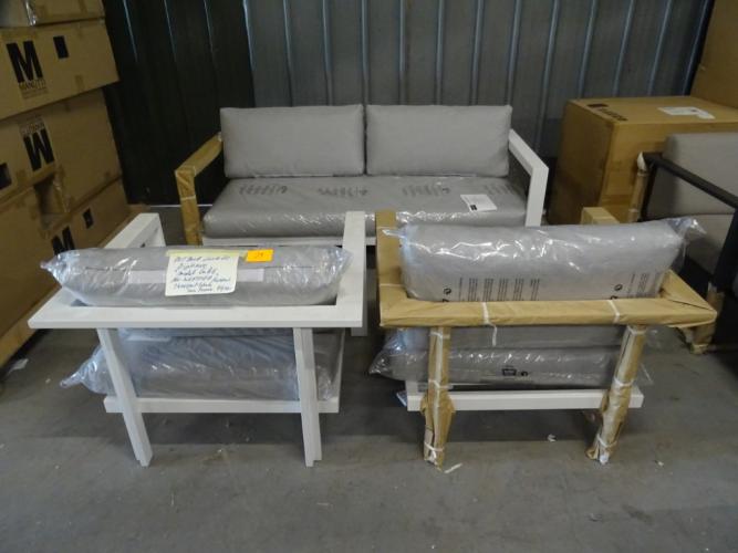 driezit (l:1950) + 2x éénzit, all-weather kussens, (transportschade aan frame)