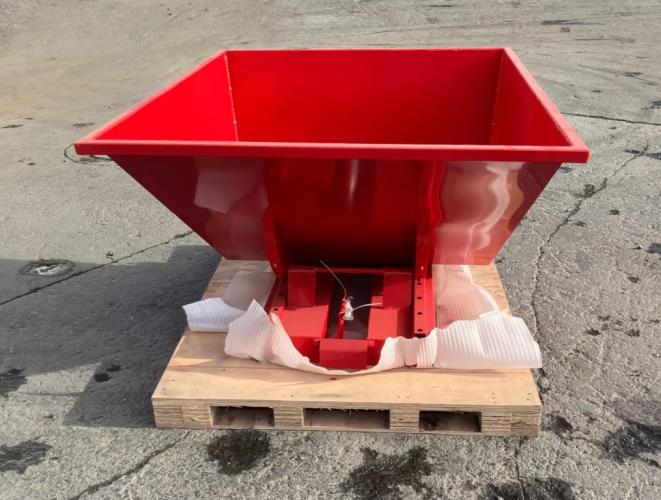Kleur: RAL3020 (Verkeersrood) - Hoogte: 870mm - Breedte: 1215mm - Breedte inrijkokes: 230mm -Hoogte inrijkokers: 100mm - Afstand tussen de vorken: 160mm -Lenhte: 1525mm - volume: 0,9 m³ - Laadvermogen : 2000kg - Automatische kantel functie - Gewicht: 122kg - Conditie: nieuw maar afbladerende lak.