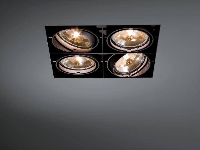 Ledsc4 Quad grid in trimless armatuur, randloze design inbouw spots, geschikt voor kantoor, winkel, showroom, ontvangstruimten, ook in woonkamer, de keuken, in slaapkamers, inloopkasten. Kardanisch kantelbaar en in hoogte verstelbaar, dimbaar, geschikt voor led en halogeen lampen van het type AR111. Merk: ledsc4, Type: DM-0084-14-00, Afmeting ca.: 30.4 x 30.4 x 8 cm. Max aantal lichtbronnen: 4. Kardanisch verstelbaar: Ja. Dimbaar: Ja. Inclusief inbouwframe: Ja. Kleur: Zwart