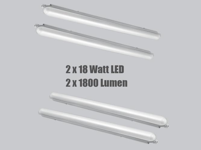 Deze A++ klasse IP65 armaturen hebben een energie verbruik van slechts 18 watt. De inbegrepen LED module geeft een hoogwaardig licht met een natuurlijke lichtkleur. Het spatwaterdicht IP65 gecertificeerde kan zowel wel in droge ruimten als in vochtige ruimten bij temperaturen vanaf -20 graden. Het armatuur is een perfecte vervanger van alle reguliere TL lampen en levert een besparing op van meer dan 50%. Led , Afmeting: 600 x 68 cm x 61 mm. Led lichtbron: ja, lichtsterkte 18W, lichtkleur 4000K, lumen: 1800 lm, Straal hoek: 120 graden, Afscherming: IP65.