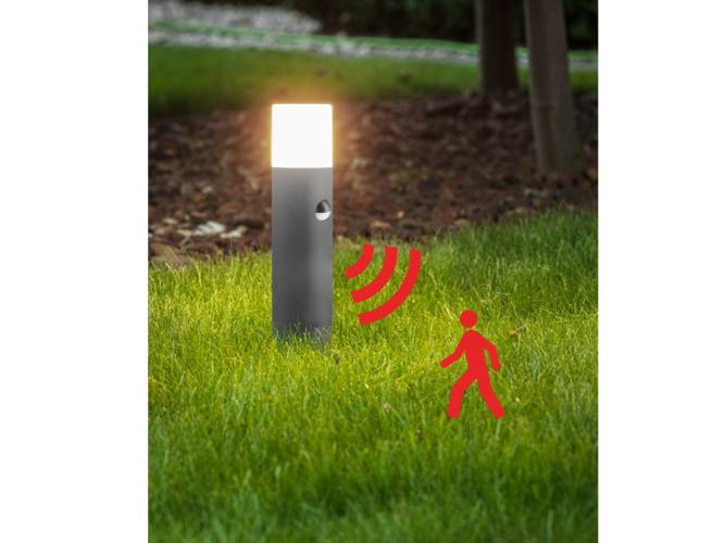 De Cortona lampen serie zijn gemaakt van hoogwaardig aluminium afgewerkt in grafiet poedercoat. Met een hoogte van 40 cm is hij zeer geschikt voor installatie langs paden, patio's, terrassen, tuinen en veranda's. Dankzij de IP44-bescherming is de lamp perfect bestand tegen regen, vochtigheid, stof en vuil. De lamp is voorzien van een bewegings sensor en kan daarmee voor een energiebesparing zorgen omdat hij zowel 100% aan kan zijn of alleen aan springen wanneer er beweging wordt gezien. Afmetingen: Ø80x400mm, voet Ø120mm, Kleur: Grafiet Zwart, Afwerking mat. Spatwaterdicht: Ja, IP44, Type: vloer lamp / grond armatuur Bijzonderheden: Dit product is volledig nieuw