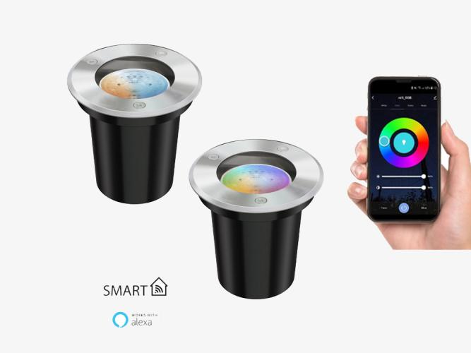 Deze grondspots zijn zowel middels een App of middels Alexa of Google Home aan te sturen. De verlichting is van kleur te veranderen, is dimbaar, maar is ook te stellen in een schema of aan te sturen op muziek. Zo creëer je op snelle wijze zeer unieke en bijzondere licht decoraties welke je tuin direct sfeervol zullen maken. De armaturen zijn voorzien van thermisch gehard glas waardoor ze een zeer hoog draagvermogen hebben, daardoor kun je er ook veilig met de auto over heen rijden. Afmetingen: diameter 9 cm x hoogte 8 cm. Inclusief inbouw moffel. Materiaal INOX RVS. Fitting: GU10, afscherming: IP65 spatwaterdicht. Lichtbron: Ledvance Smart GU10 led, 4.9 Watt, Kleur: 2700K - 6500K, 400 lumen. Dit betreft een nieuw product.