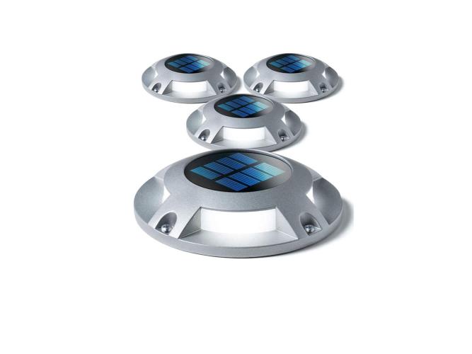 Deze schitterende design spots kunnen overal en snel geplaatst worden. Ze kunnen de tuin op een sfeervolle manier verlichten, maar ook het terrras, een pad of voor een praktische verlichting van een oprijlaan zorgen. Met deze design spots creëer je op snelle wijze zeer unieke licht decoraties welke de tuin direct sfeervol zullen maken. Het grote voordeel van deze grondspots is dat er geen ondergrondse kabels aangelegd hoeven te worden. De spots hebben een schemersensor en zijn zon oplaadbaar, de verlichting gaat automatisch aan wanneer het donker wordt en zal ook zelf weer uitgaan wanneer het licht wordt. De ingebouwde zonnepanelen laden de spots binnen 4-6 uur weer volledig op. De brandtijd bedraagt vervolgens 16 a 18 uur na een volle oplading. Type: Grondspots, Lichtbron: led, inbegrepen, lichtkleur: helder wit, IP67 spatwaterdicht. Afmetingen ca 12 x 4 cm, maximale belasting 500 Kg, Conditie: Nieuw