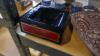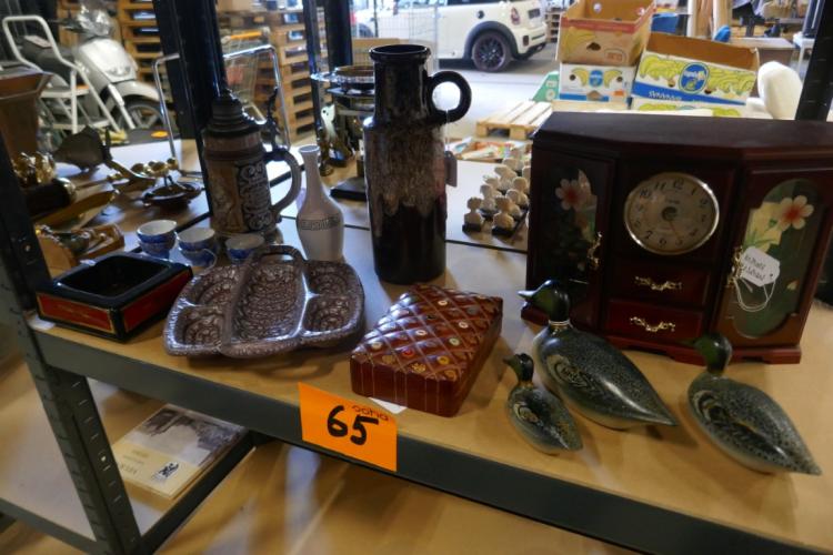 Decoratie : trio eenden - tafelklok met kastje - juwelierkistje - sierlijke schaal - mooie vaas - wit vaasje - kleine koffiekopjes - asbak - bierkan