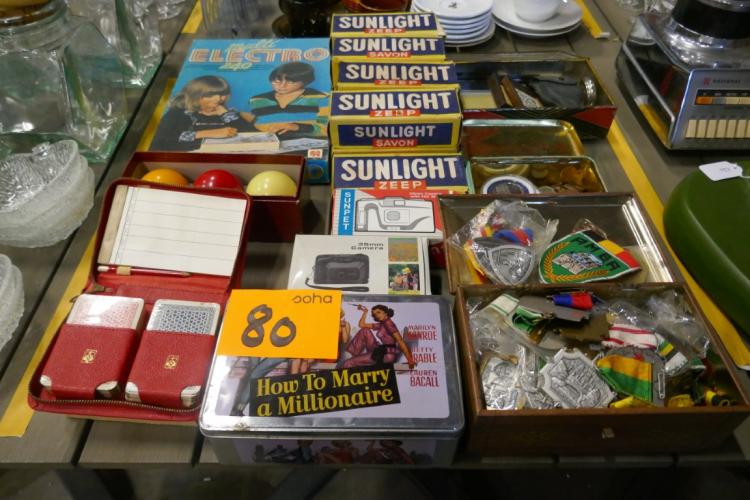 Reeks vintage spullen waaronder : retro zepen - retro fototoestel - kaartenspel in etui - biljartballen - vintage gezelschapsspel - vintage medailles - oude munten - enz…