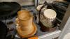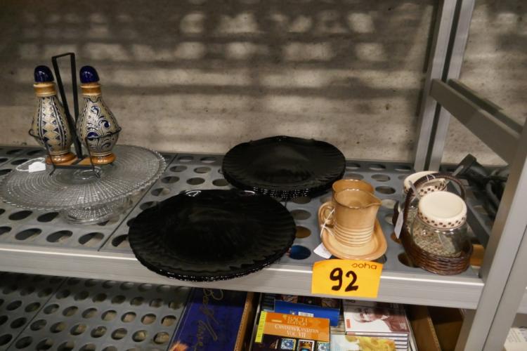 Zwarte borden schelpvorm - glazen taartplateau ( waarschijnlijk VAL SAINT LAMBERT ) - sierlijke zout en peper vatjes - suikerpotjes met mandje - koffie en melk kannetje