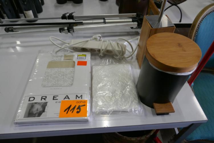 WC borstel - vuilbakje - Beddenovertrek - verlengkabel met verdeeldoos - statief voor fototoestel - 2 verfpotten - rietenmand - prullenbak met voetbediening