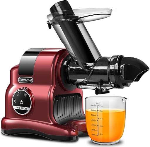 Gebruikssporen, getest en werkend,lichte schade aan vijzel (zie foto), AMZCHEF Sapcentrifuge met grote vulschacht van 80 mm, 150 watt, sapcentrifuge met 2 snelheden en terugloopfunctie, , kleur rood, B0CCY1R168