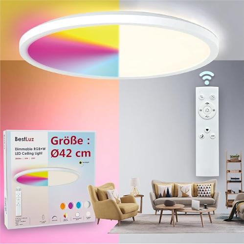 Ongebruikt, getest en werkend, geen remote, BestLuz Led-plafondlamp, ledpaneel, plafondlamp, diameter 42 cm, 24 W, RGBW + neutraal wit, 4000 K, met achtergrondlichteffect, afstandsbediening, voor badkamer, slaapkamer, woonkamer, keuken,B0B74K15LF