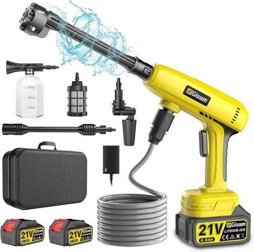 Gebruikssporen, werkt, compleet, Hogedrukreiniger, 60 bar, mobiel hogedrukwaterpistool met 2 x 4000 mAh accu, 6-in-1 multifunctioneel mondstuk, 180° draaibaar mondstuk, 5 m slang, filterketel, geschikt voor auto's, terras en ramen, B0D2XFVJC7