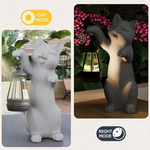 Ongeopend, mikilov Hars Beeld Kat met Lantaarn op zonne-energie (Hand L 40cm decoratie kat olifantgrijs, B0DQNB994C