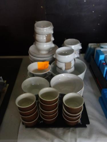 Set met soepkommen, dessertborden, dessertpotjes en grote kom