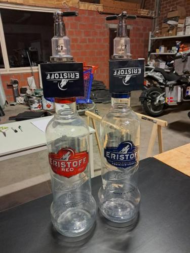 Grote flessen + houder v Vodka Eristoff 2 x 65 cm