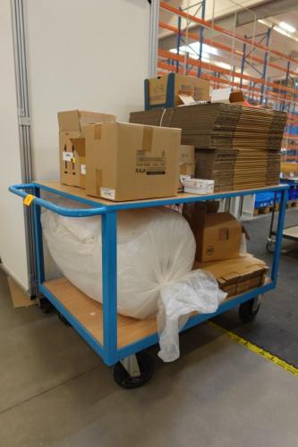 Verrijdbare magazijnkar + inhoud verpakkingsmaterialen