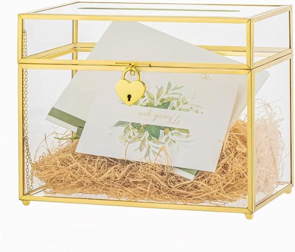 Ongebruikt, ok, NCYP Trouwkaartendoos met sleuf en slot - 24,8 x 14,2 x 19,6 cm - goudkleurige glazen envelop met deksel voor verjaardagsfeestje receptie - vintage rechthoekig middelpunt decoratie handgemaakt, B0CNYKFG9C