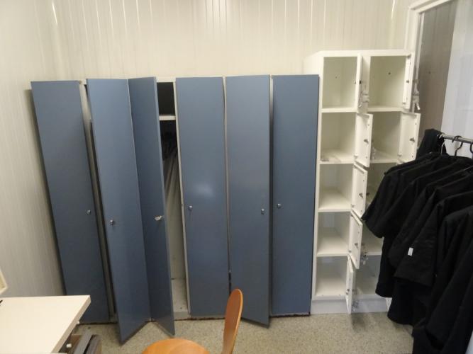 Oa. 5 x stoel, 2x tafeltje, EHBO-kit, droogrek, 4x locker