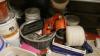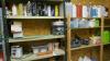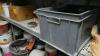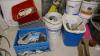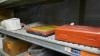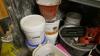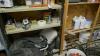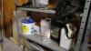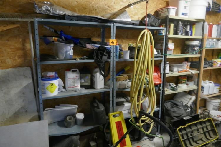 Metalen rekken met inhoud : diverse produkten - werf - lijmen - werkkledij - houtbeits - ehbo kist - stukadoor materiaal - emmers - enz...