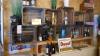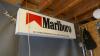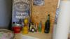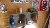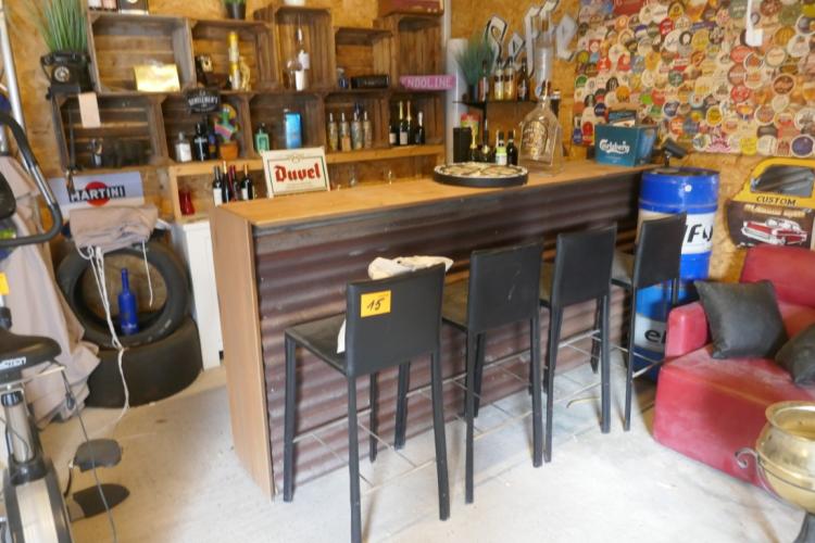 Complete MANCAVE ingerichte bar met allerlei collector items : toog - 4 barstoelen - rek gemaakt in bierkratten - diverse flessen drank - oude telefoon - decoratie - 2 koelkasten met drank - microfoons - oude typmachine - wanddecoratie - groot vat - lichtpaneel MARLBORO - gasmaskers - enz...