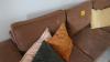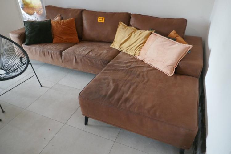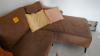 Houten hoekzetel bruin stoffen bekleding met bijhorende kussens