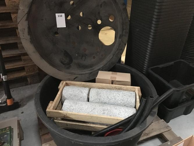 PVC kuip, polyester deksel, 3 granieten zuilen en koppelstukken. Ongebruikt