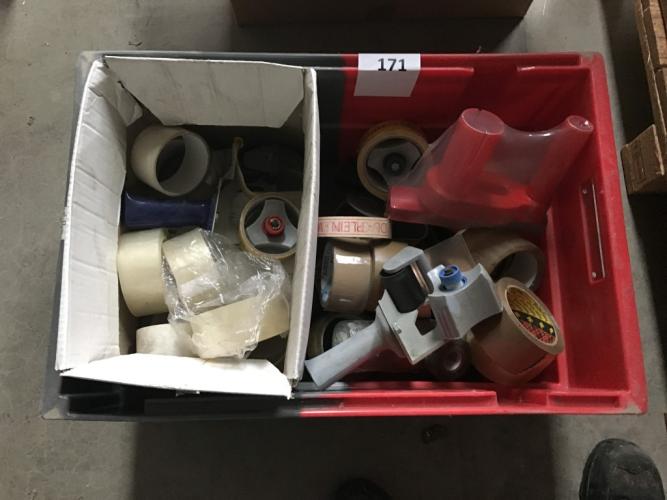 Partij diverse plakbandrollen en afrollers