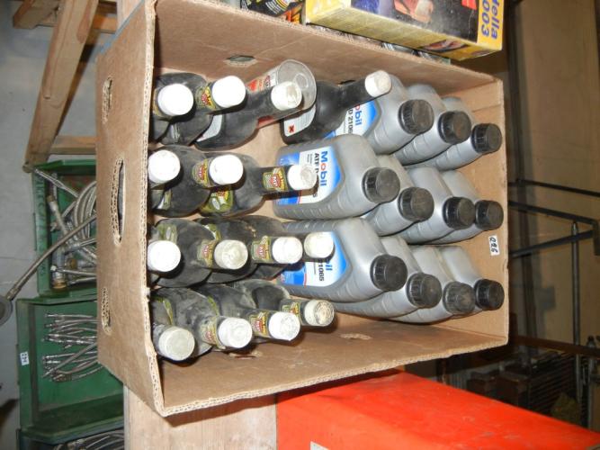 Doos met transmissieolie en flessen motorreiniger