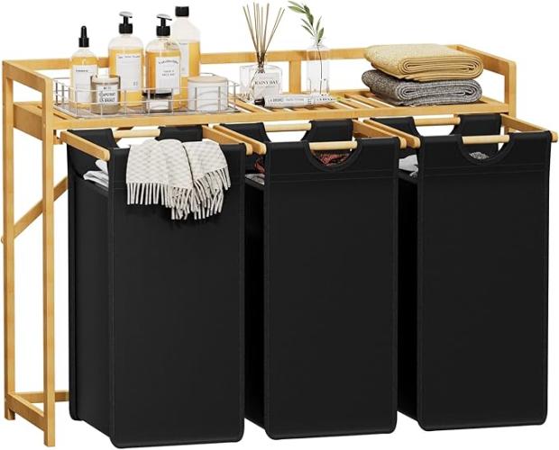 Ongebruikt, volledig, ok, licht beschadigde verpakking, Lifewit Wasmand met bamboeframe, 150 liter, wasverzamelaar, 3 vakken, afneembare wasbox, bamboe, wassorteerder voor kleding, handdoeken, speelgoed, 96. 2 x 33,4 x 72 cm, zwart, B0DQTHW8ZW