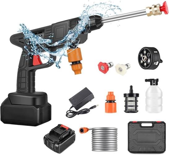 Gebruikssporen, getest en werkend, ok, Hogedrukreiniger op batterijen, 48 V, max. 90 bar, draagbare hogedrukreiniger met 6-in-1 multi-spuitmond, 5 m slang, verlenglans, gereedschap voor het reinigen van de auto voor buiten, B0DT5SYSKL