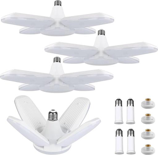 Ongeopend, in seal, Yiliaw Set van 4 led-lampen, 80 W, 8000 lumen, werkplaatslamp met 4 lampfittingen, 4 fittingen, 6500 K daglicht, vervormbare plafondlamp, schroef in garagelamp voor kelder, slaapkamer, winkel, B085KXJT7H