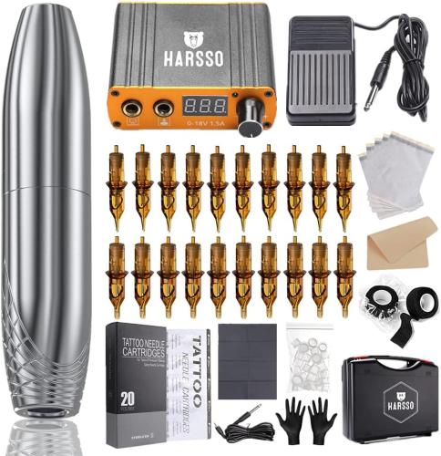 Ongeopend, in seal ,Harsso Tattoo Rotary Pen Machine Kit met 20 patroon naalden/voeding/voetpedaal/Fake Haut en doos, complete Tattoo Kit , B0962JQ7FR