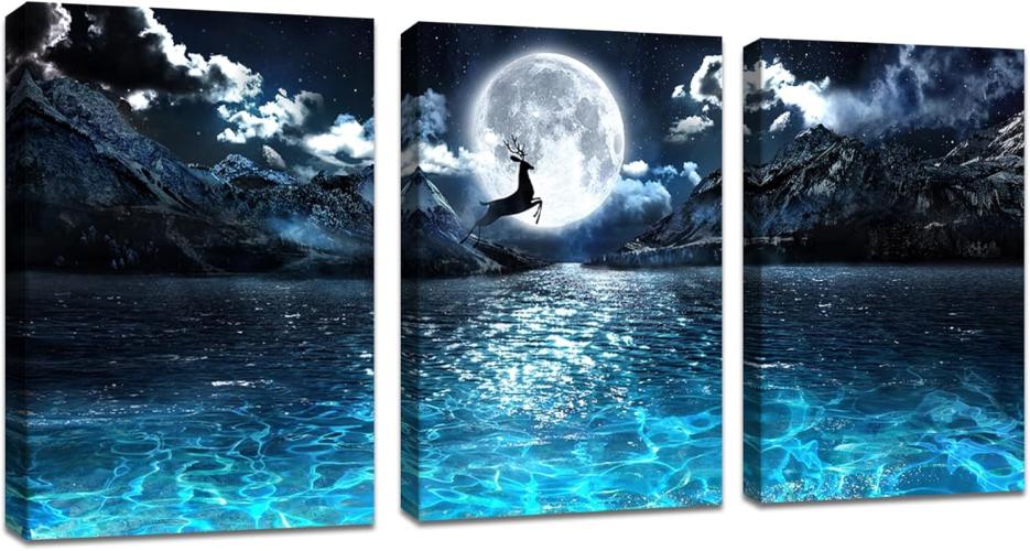 Ongeopend in seal, 3 stuks canvasfoto's met lijst, lichte maan op blauwe oceaan, nachtfoto op canvas, klaar om op te hangen, 120 x 60 cm (40 x 60 x 3) B0CLXVYVWK