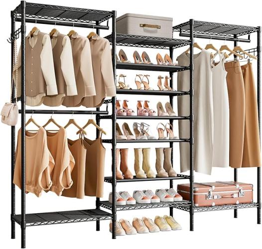 Ongeopend, in seal, KZOBYD Kledingrek, multifunctionele kapstok met in hoogte verstelbare legplanken, zware belasting, kledingstang met schoenenrek, metalen kledinghanger, kledingkast met haken (zwart), B0CMLN54SN