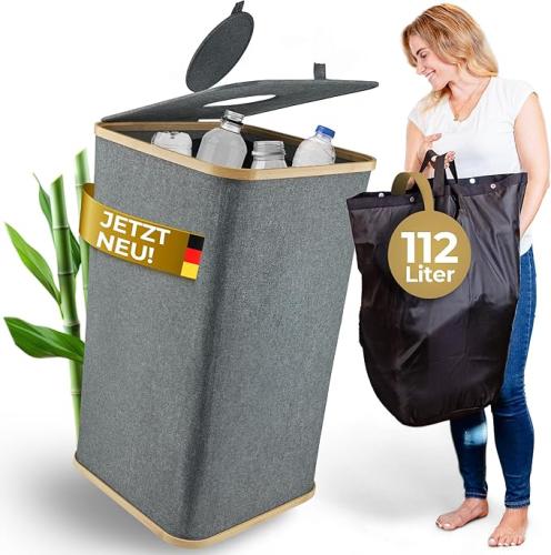 Ongeopend, ALMAGI® - Verzamelcontainer XXL '112L' wasmand – praktische statiefflesjesverzamelcontainer met uitneembare waterdichte binnenzak – extreem stabiel dankzij het onderste bamboeframe [112 l] recyclingcontainer, B0D7SW42LK