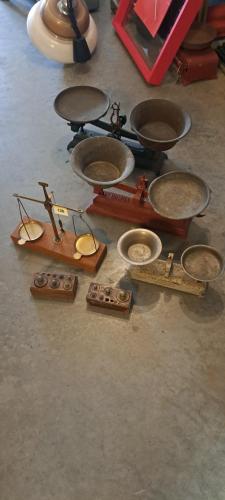 4 weegschalen en 2 blokjes gewichten