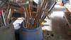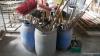 Plastieken tonnen met allerlei opkuisgerief : borstels - trekkers - spade's - tuingereedschap - enz..