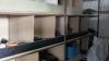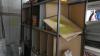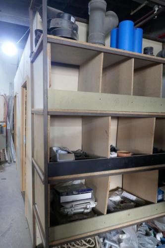 2 stalen magazijnrekken uitgewerkt in houten bakken ( zonder inhoud )