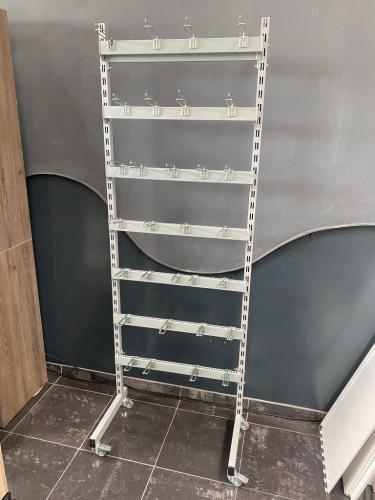Merk DATEC - Winkelrek bestaande uit : 2 staanders, 2 verbindingsstangen, 7 liggers, 30 haken, 4 wielen - Hoogte +/- 190 cm. - Breedte 70 cm.