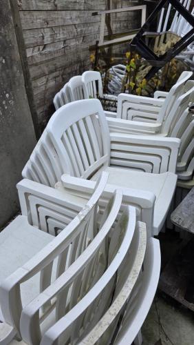 Lot van 28 gebruikte witte tuinstoelen, locatie Lauwe