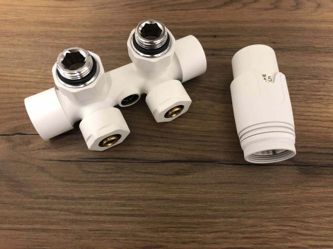 1 x Thermostatische design kraanset met middenaansluiting uit muur (haaks) - Omkeerbaar - Kleur wit- Met 16mm knelset - Voor badkamerradiatoren en design radiatoren - DW-2