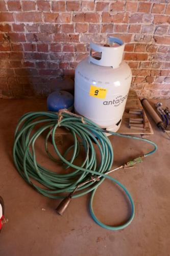 Dakbrander met gasslang en fles + 3 kleine lege gasflesjes