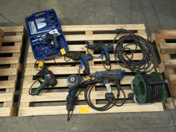 2x kabel , Haakseslijper Ryobi , 3x Heatgun Bosch, 5x lijmpistool
