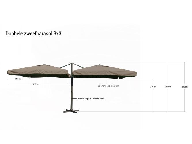 Voorzien van: Groot dubbel parasoldoek met een afmeting van tweemaal ø300 cm. - Sterk en stevig frame gemaakt van aluminium.