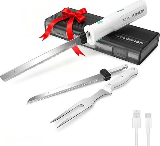 Minieme gebruikssporen, getest en werkend, ok, verpakking ontbreekt, HAUSHOF elektrische messenset 8V, snoerloos keukenmes met roestvrijstalen messen, 2000 mAh batterij voor nauwkeurig snijden van brood, vlees en kaas, met opbergdoos, wit, B0D21VSTS4