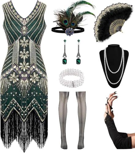 Ongeopend, ok, WILDPARTY Jaren 20-jurk voor dames, flapperjurk, kanten waaier, hoofdband, pailletten, kralen, franjes, jaren 20-accessoires, vintage maffia-kostuum,B0CZMNZ5ZV