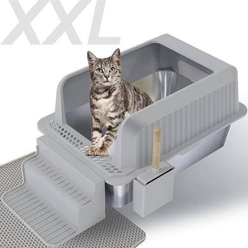 FREEUP Kattenbak XXL roestvrij staal grote hoge open rand met schep L D: H 60,5 x 40,5 x 30 cm grote kattenbak, antislip, mat, lekvrij, B0D25D52LK