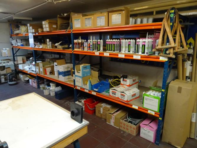 inhoud: kaleerblokken, Kerafix, silicone (over datum), 1x Dewalt werktafel, ijzerwaren, ... (alles moet mee exclusief rekken), 1ste verdiep